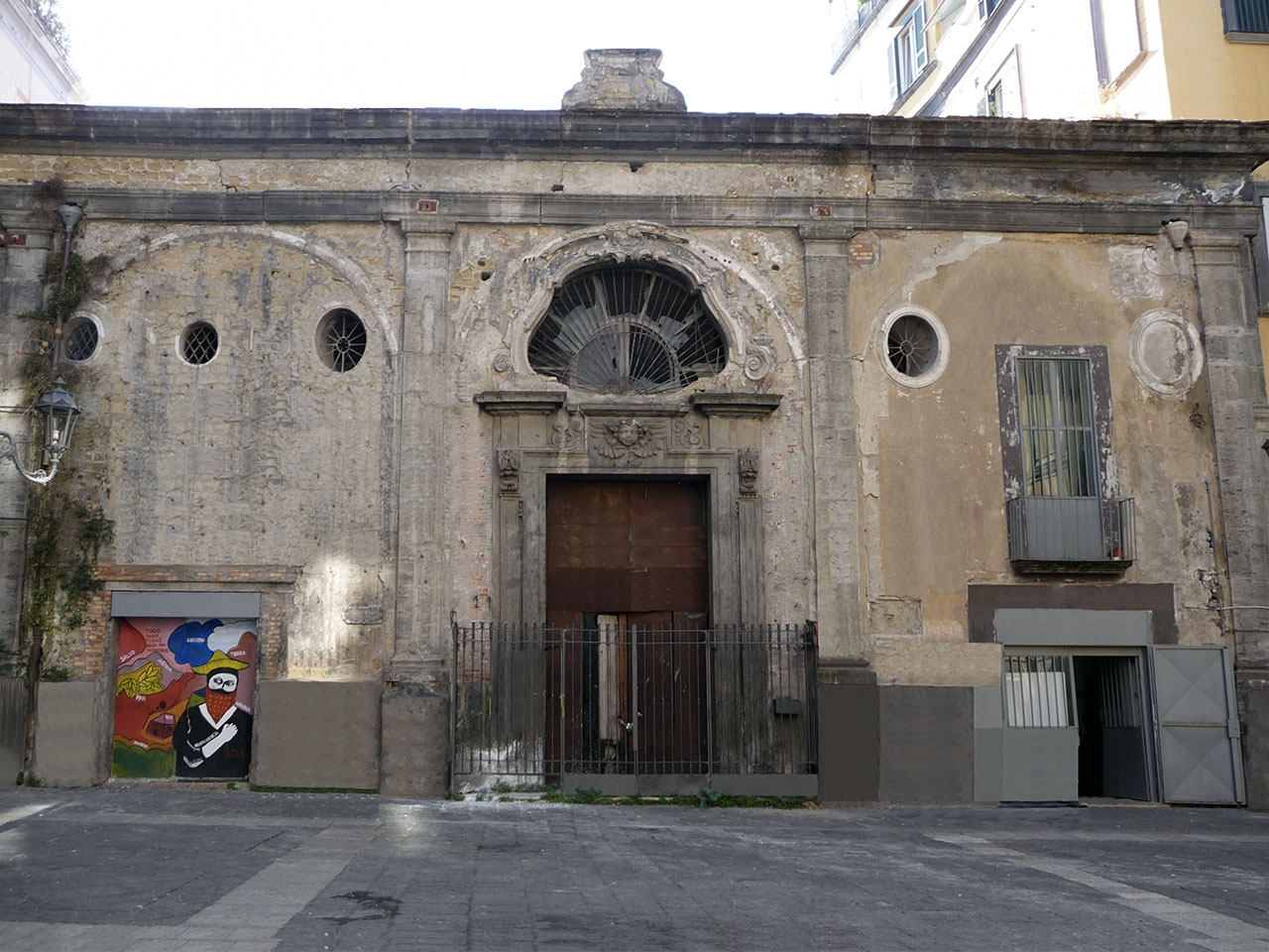 The Congrega dei Barbieri, in 1616, bought the location which had been the site of the banks and changed the previous 16th-century loggia into a church. From this follows the origin of the particular construction of the church, which can be accessed through a 17th-century portal made of trachytic rock, whose frame is decorated with a cherub's head.